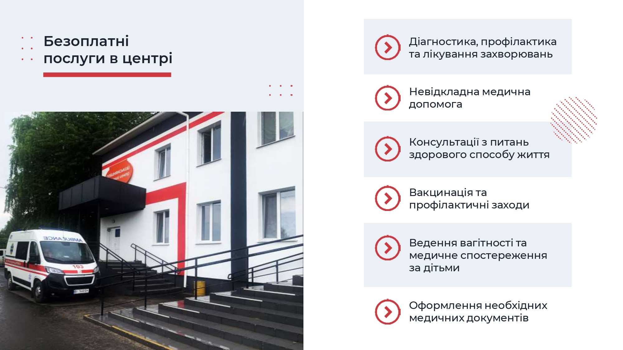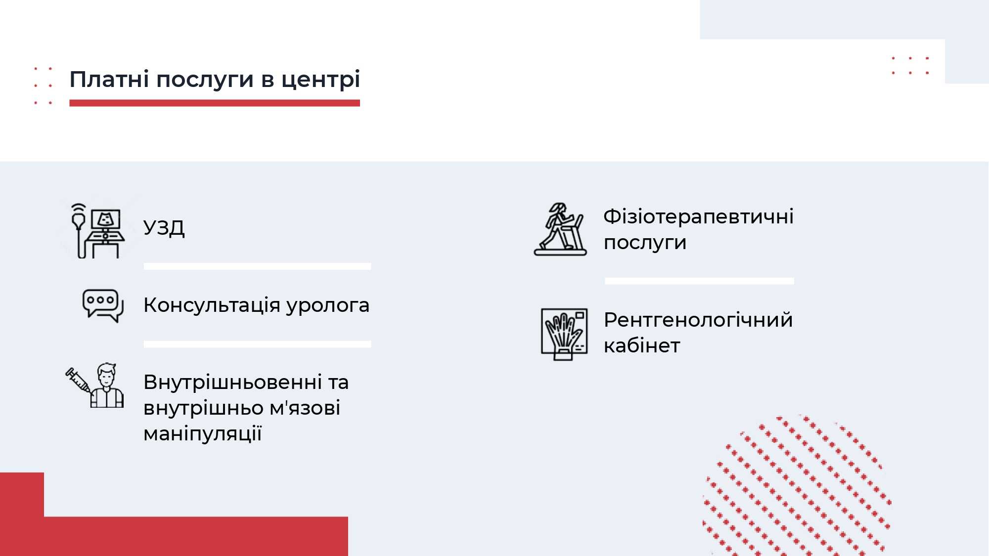 Працюємо, щоб в комфортних умовах, використовуючи знання та інноваційні методи, зберегти та підтримати найбільшу цінність – Ваше здоров’я.